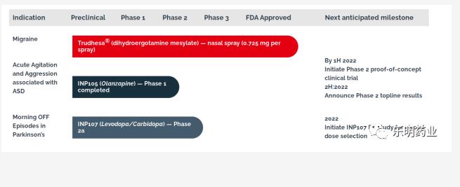 Trudhesa?(dihydroergotamine mesylate)(代號為INP104)為利用POD遞送技術(shù)開發(fā)的改良型新藥,活性成分為老藥甲磺酸雙氫麥角胺,用于治療成人有無先兆性的急性偏頭痛,規(guī)格為0.725mg/spray,2021年9月獲得FDA批準上市。INP105(奧氮平)目前處于Phase1,用于治療急性激越。INP107(左旋多巴/卡比多巴復(fù)方)目前處于Phase2a,用于治療治療帕金森的OFF事件。
