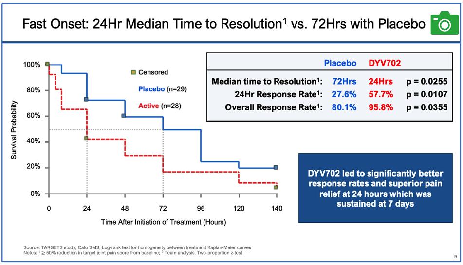 Khanna博士繼續(xù)說道:“在符合方案的人群中,我們發(fā)現(xiàn)DYV-702組疼痛緩解的中位時間為24小時,而對照組為72小時, DYV-702組24小時的有效率為58%明顯優(yōu)于對照組的28%。這類患者歡迎或傾向一種按需、快速、局部應用的治療方法,可在痛風發(fā)作前24小時內提供有臨床意義的疼痛緩解。在看到這些令人鼓舞的第2階段結果后,我們期待著在后期臨床研究中進一步探索這類候選藥物。”