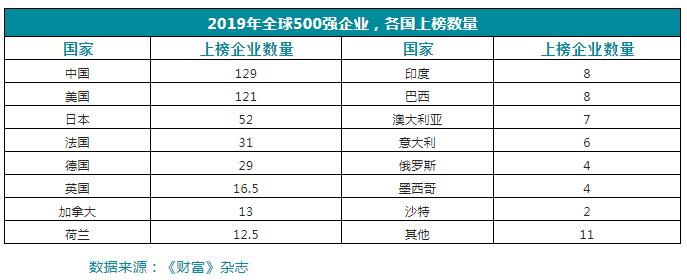 2019年“世界500強(qiáng)”榜單已經(jīng)出爐,中國企業(yè)取得的成績十分亮眼,我國企業(yè)上榜數(shù)量多達(dá)129,全球最多!而作為“常勝之軍”美國,其企業(yè)上榜數(shù)量為121家,已經(jīng)被我國趕超;日本企業(yè)上榜數(shù)量則排在第三,有52家,與中美拉開了差距。