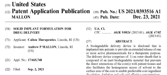 BioCorRx公司位于加州南部城市阿納海姆(加州迪士尼樂園建于此),公司聚焦于藥物成癮和酒精成癮領(lǐng)域,致力于開發(fā)更具優(yōu)勢的新型療法。BICX104 implant的藥物遞送技術(shù)來自于Calista Therapeutics,BioCorRx通過收購Calista的專利技術(shù)獲得,該專利US2021/0393516于2021年遞交美國專利局。