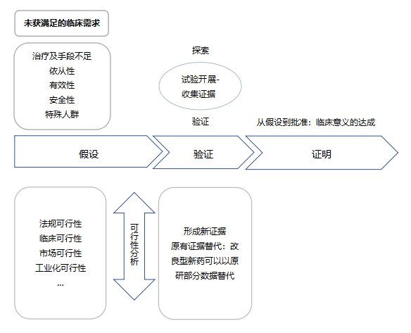 關(guān)于藥物開發(fā)中的“假設(shè)-驗(yàn)證”理論多用于新藥(505(b)(1))改良型新藥(505(b)(2)),方法論步驟首先是假設(shè)(即提出問題),然后開展試驗(yàn)對假設(shè)進(jìn)行驗(yàn)證。