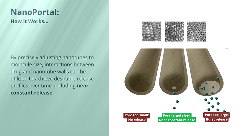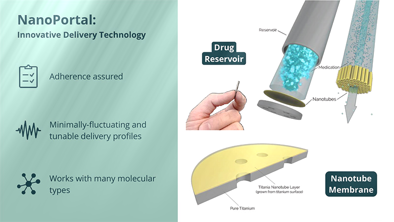 Vivani 醫(yī)療 CEO Adam Mendelsohn表示,他們致力于推動(dòng)GLP-1皮下植入打入糖尿病市場(chǎng)。公司開發(fā)的皮下植入為艾塞那肽植入物的藥械組合遞送系統(tǒng),代號(hào)為NPM-119,該遞送系統(tǒng)基于NanoPortal技術(shù)平臺(tái)。該植入物內(nèi)部空間完全由藥物填充,藥物通過(guò)末端的納米多孔膜控制藥物的釋放,達(dá)到可實(shí)時(shí)控制釋放的速度和時(shí)間,最高可以達(dá)到6個(gè)月的長(zhǎng)效釋放。