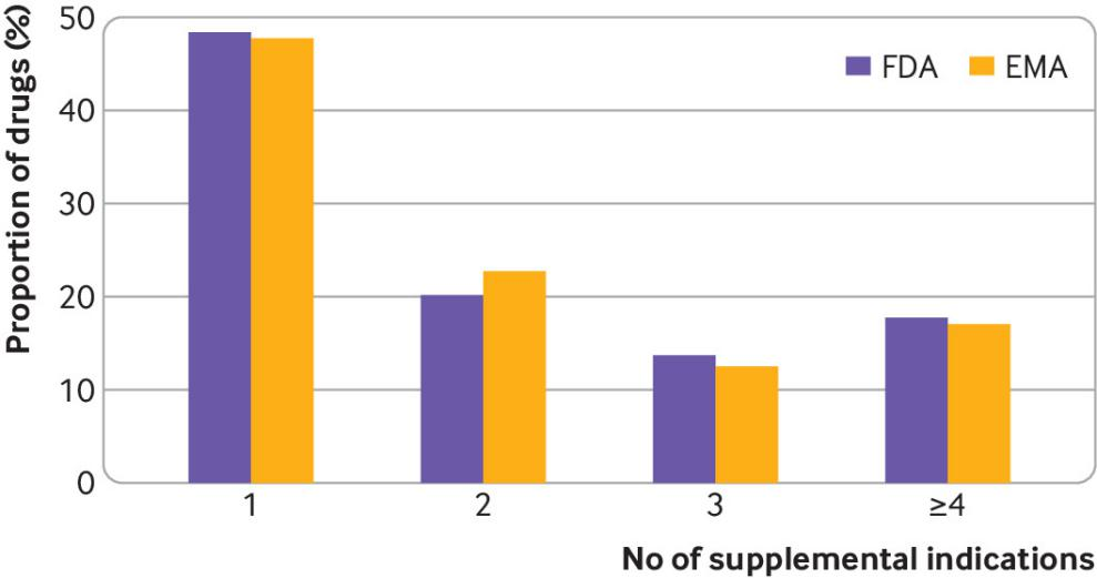 在美國,48% 的藥物有一種補充適應(yīng)癥,20%有兩種,14%有三種,18%有四種或更多。在歐洲,48%的藥物有一種補充適應(yīng)癥,23%有兩種,13%有三種,17%有四種或更多。FDA 和 EMA 批準的大多數(shù)(58%)適應(yīng)癥都是用于治療各種癌癥。