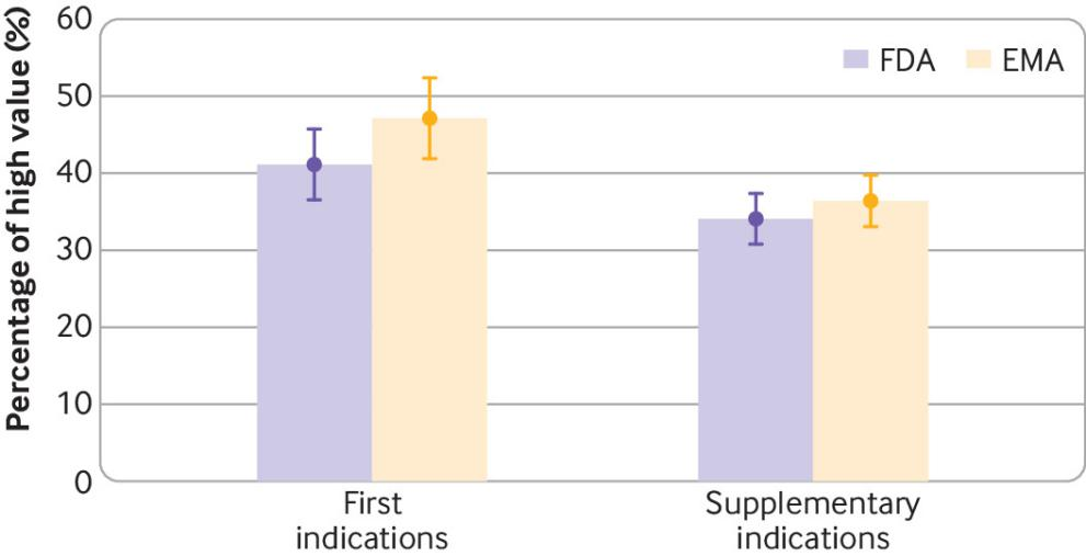 “在美國和歐洲,只有不到一半的批準的首發(fā)適應(yīng)癥被評為具有高治療價值,而批準的補充適應(yīng)癥被評為具有高治療價值的比例大大低于批準的首發(fā)適應(yīng)癥?!?/span>