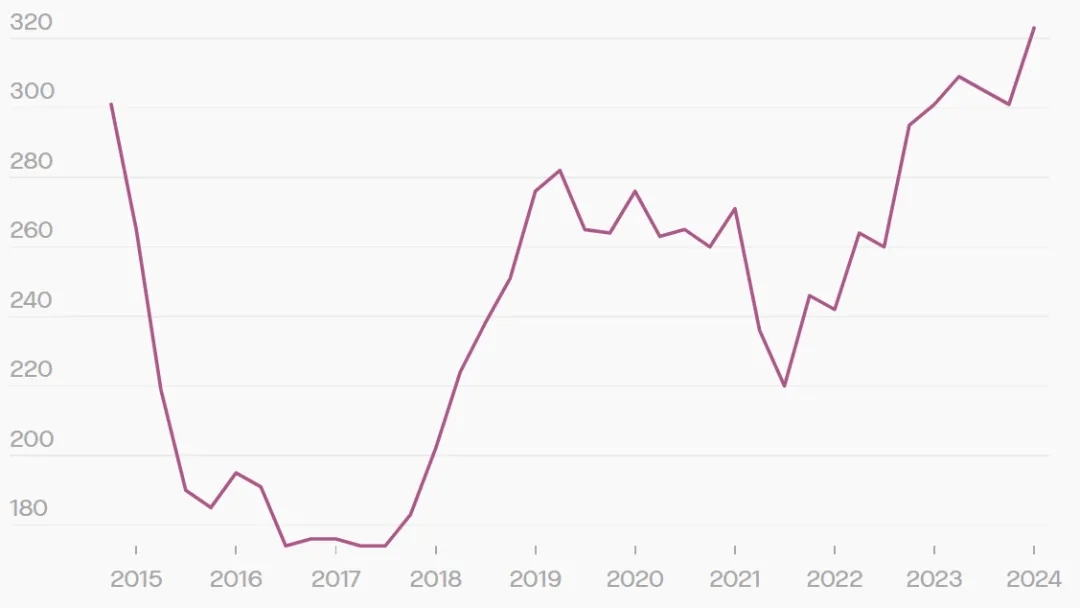 過去十年中美國每個季度的藥物短缺數(shù)量